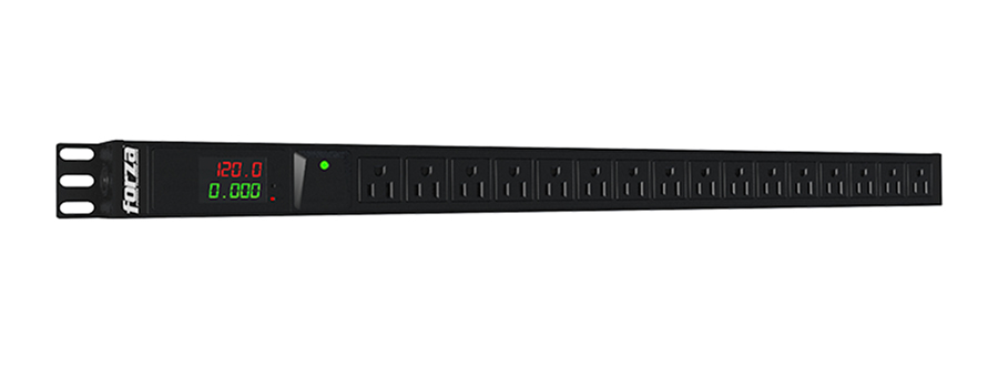 – FPD-1611M0U: PDU medible vertical PDU 1800W, 16 tomas 5-15R, 0U, 110V en formato vertical para 110V, con entrada 5-15P y pantalla LCD para monitoreo detallado.